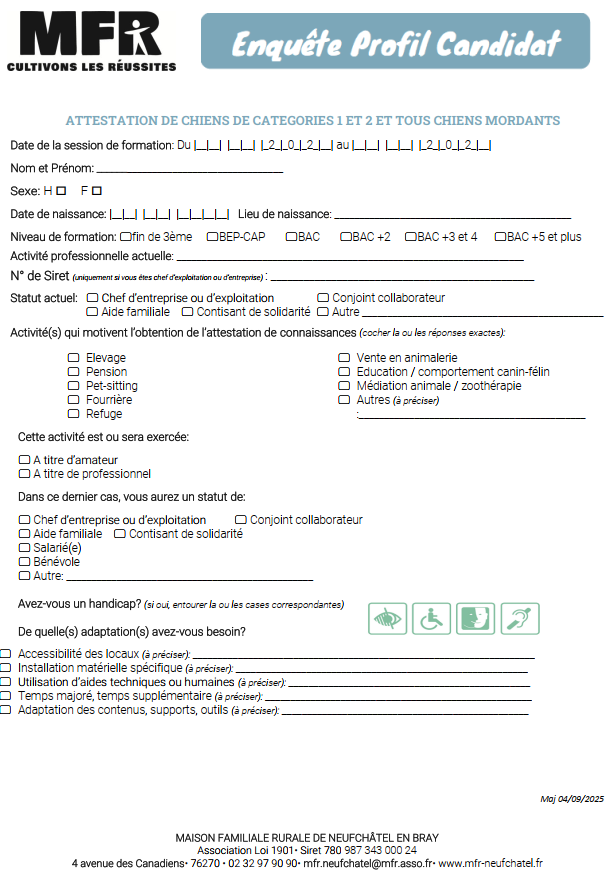 Pour toute information concernant les adaptations de nos formations nécessaires aux personnes en situation de handicap, Contactez notre référente "Handicap" Madame Joanna BEGIN à l'adresse mail suivante : joanna.begin@mfr.asso.fr