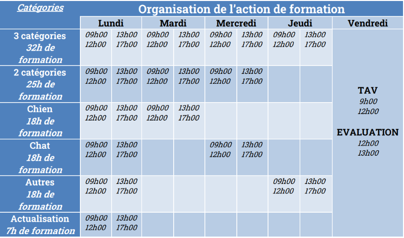 La formation a pour objectif de transmettre des connaissances relatives aux besoins biologiques, physiologiques, comportementaux et à l'entretien des animaux de compagnie d'espèces domestiques et de renforcer la prise en compte du bien-être des animaux. Huit domaines de compétences sont abordés :