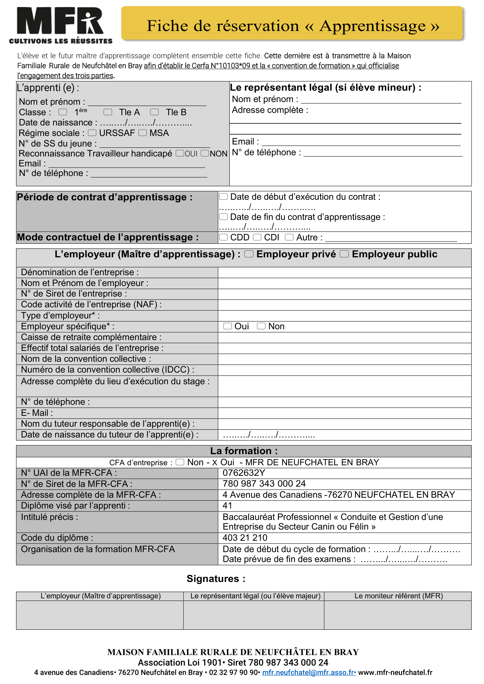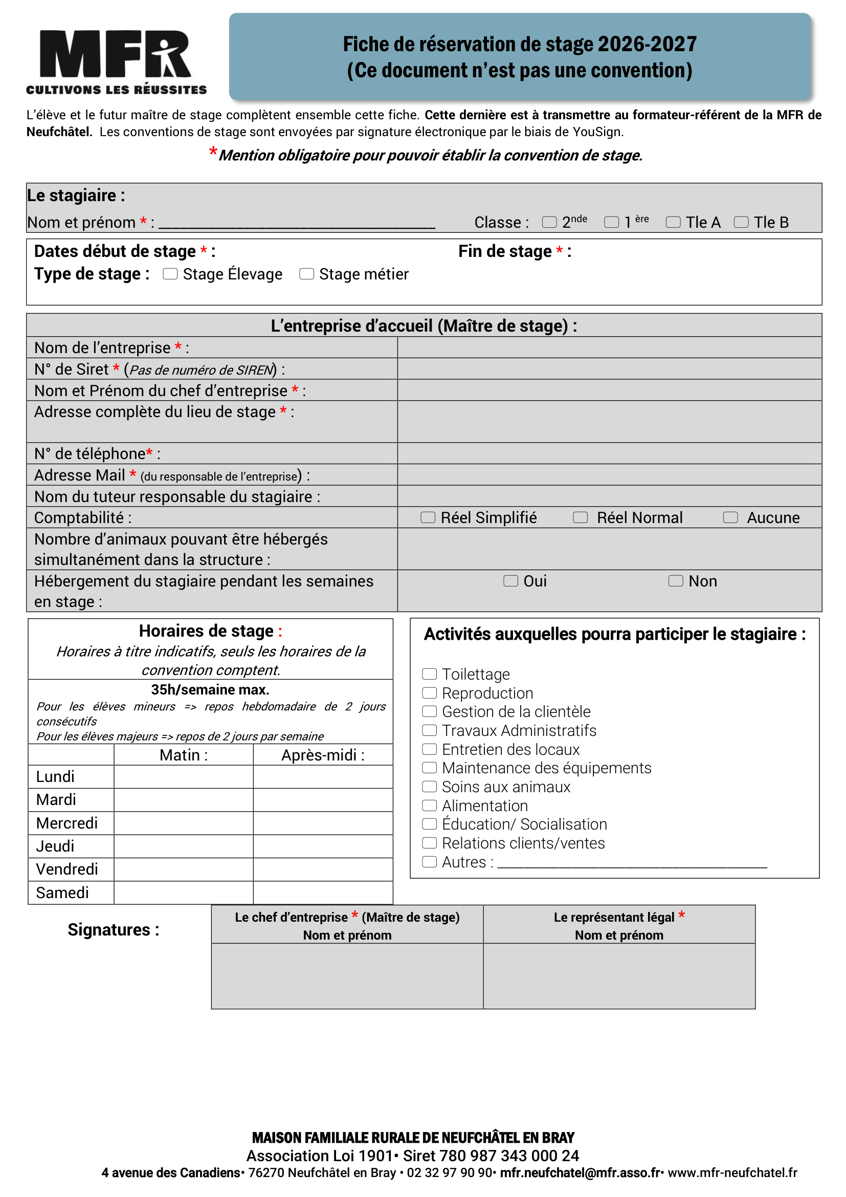 Statut scolaire 2026-2027Attention : La fiche de réservation n'est pas une convention de stage Cette fiche est à faire compléter par le futur maître de stage et à retourner à la MFR afin d'établir la convention de stage. Télécharger la fiche de réservation![]() MàJ le 09/04/2026 Statut apprentissage 2026-2027Cette fiche est à faire compléter par le futur maître d'apprentissage et